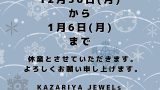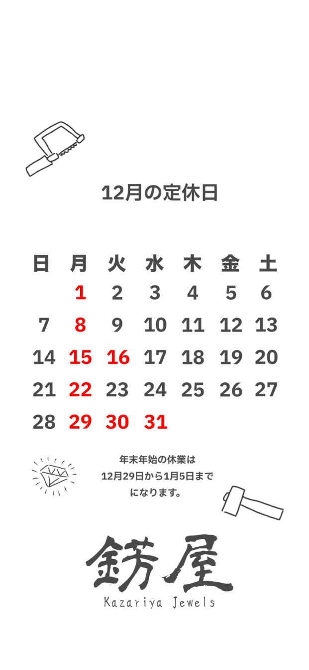 12月のお休みと年末年始の休業のお知らせ お知らせ X Facebook はてブ Pocket LINE コピー 2025.12.03 新着記事 1月のお休み 2026.01.14 年末年始のお休み🎌 2025.12.30 12色のマリッジリング♪ 2025.12.30 12月のお休みと年末年始の休業のお知らせ 2025.12.03 K18アクアマリンのリングのオーダー♪ 2025.11.02